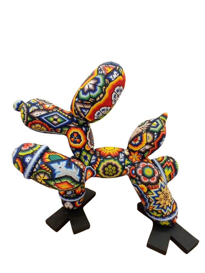 Escultura Balloon Dog perro globo intervenida arte huichol cuentas vidrio azul naranja Rick Wolfryd CHROMA
